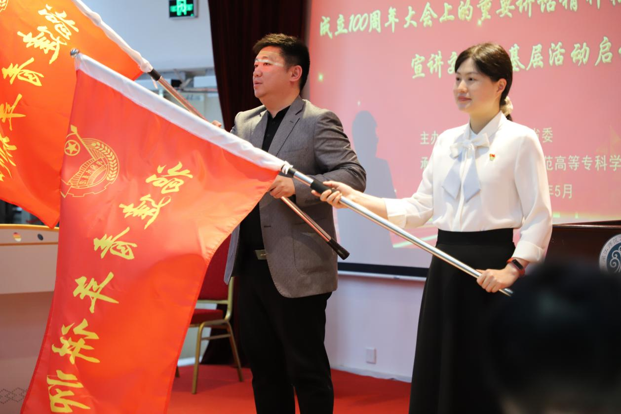 启动仪式上,闽江师范高等专科学校副校长林旻致辞。她表示,青年是高校的主力军,青年教师是高校的中坚力量,重视青年就是重视学校的长远发展。闽江师范高等专科学校将一如既往,以最大的决心支持和推动团的工作。不忘初心,不辱使命,不负众望。接着,团省委副书记邵明松为郑元凯、叶琛、陈东、吴晨怡四位“青年讲师团”代表授旗。