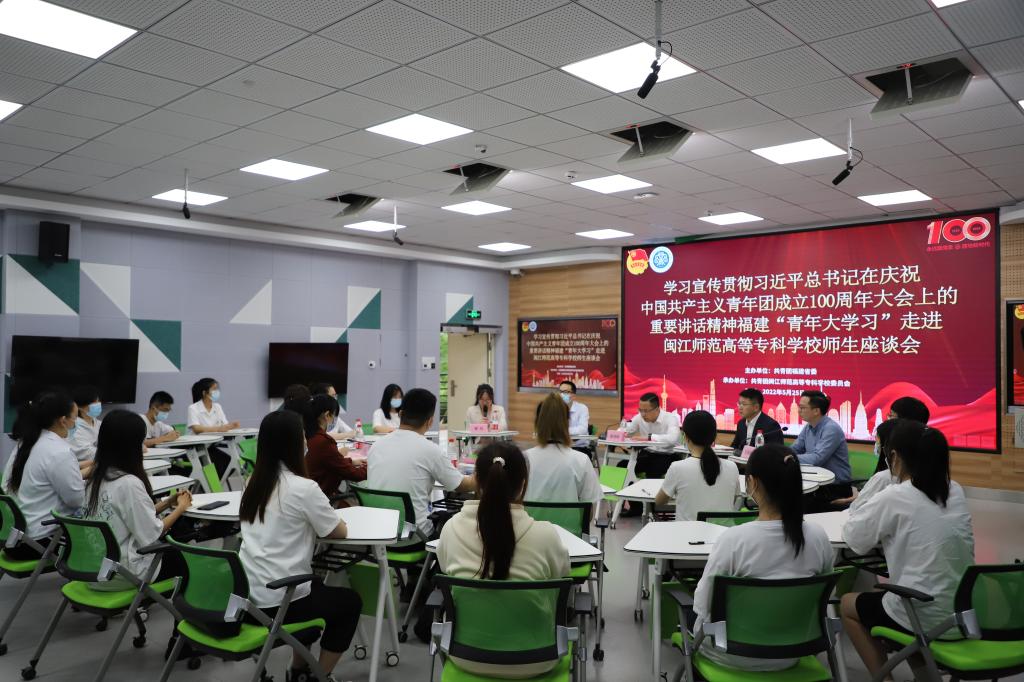 随后,邵明松副书记在3016智慧教室召开了学习宣传贯彻习近平总书记在庆祝建团100周年大会上重要讲话精神福建“青年大学习”走进闽江师范高等专科学校师生座谈会。邵明松副书记听取我校团委副书记黎凤、外语商贸学院团委书记钱小莉以及四位学生代表的学习心得分享,并做总结发言。同时,他从学习、就业、生活等方面对青年学子表达殷切期望和热情嘱托。座谈会现场氛围热烈,与会场人员交流探讨、亲切沟通,会议在热烈的掌声中结束。