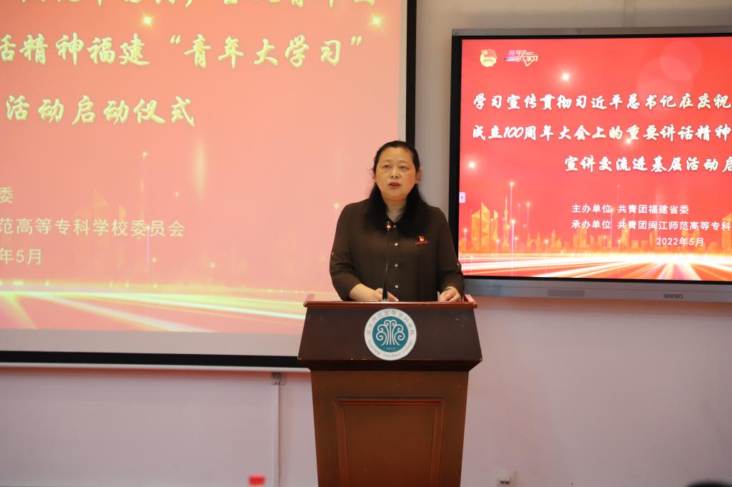 5月25日,由共青团福建省委主办的学习宣传贯彻习近平总书记在庆祝中国共产主义青年团成立100周年大会上的重要讲话精神福建“青年大学习”宣讲交流进基层活动启动仪式在闽江师范高等专科学校举行,福建青年讲师团成员、闽江师专青年师生代表200余人参加启动仪式。仪式由团省委宣传部部长蔡宏强主持,团省委副书记邵明松、闽江师专党委委员、副校长林旻、团省委宣传部副部长李延林、周伟亮,团市委四级调研员李裕天、团省委宣传部干部吴超、许静娴、校团委副书记王海波、黎凤出席仪式。