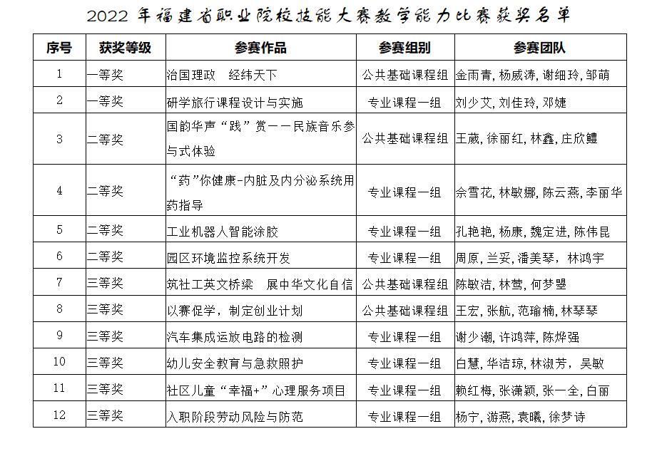 近日,福建省教育厅职成处《关于2022年福建省职业院校技能大赛教学能力比赛拟获奖名单的公示》,我校教学团队在本次教学能力比赛中共获得一等奖2个,二等奖4个,三等奖6个。