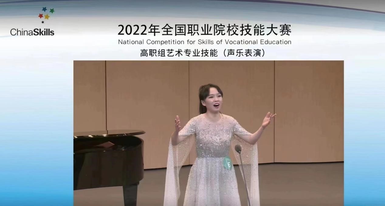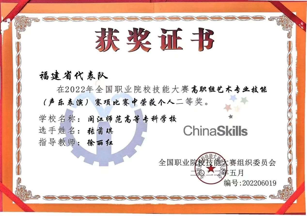 8月11日—15日,2022年全国职业院校技能大赛高职组艺术专业技能(声乐表演)赛项在河南职业技术学院举办,我校艺术学院学生代表福建省与来自全国各地的59名选手同台竞技。经过4天的激烈角逐,由徐丽红等老师指导的20级音乐教育2班张茵琪同学,面对实力强劲的对手,稳扎稳打,以第四名的优异成绩获得民族唱法二等奖。