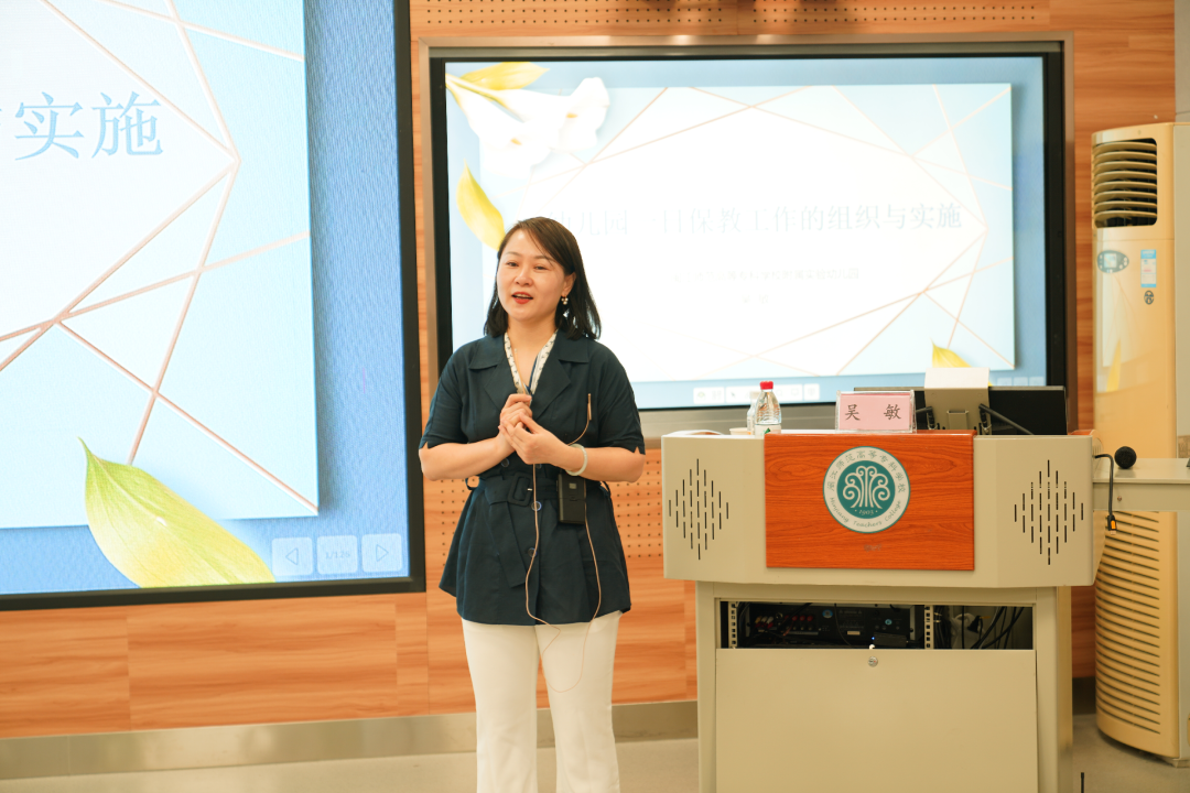 8月17日上午,闽江师范高等专科学校附属实验幼儿园吴敏园长为幼儿园新教师作《幼儿园一日保教工作的组织与实施》讲座。