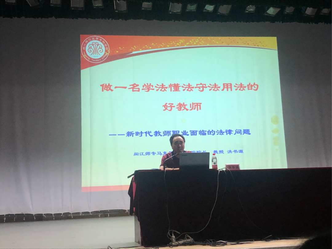 8月20日下午,闽江师范高等专科学校马克思主义学院院长洪书源教授为新教师们作《做一名学法懂法守法用法的好教师》专题讲座。