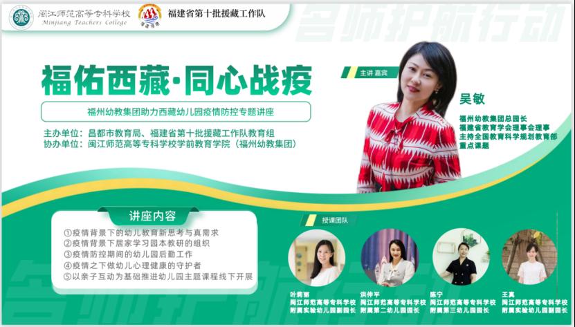 面对突然来袭的疫情,西藏自治区启动秋季学期线上教学工作。崭新的教学方式和常态化疫情防控学校后勤保障问题带来的挑战,是昌都教育系统面临的一大考题。为此,福建省第十批援藏工作队教育组第一时间协调后方优质教育资源,与福州幼教集团对接,积极商讨线上援藏教学方案,在举办线上专题培训讲座基础上,通过分享优质课程资源和防疫相关做法,编制线上教学指导意见等方式,整体布局、有力组织,多措并举,助力西藏昌都市“停课不停学”。