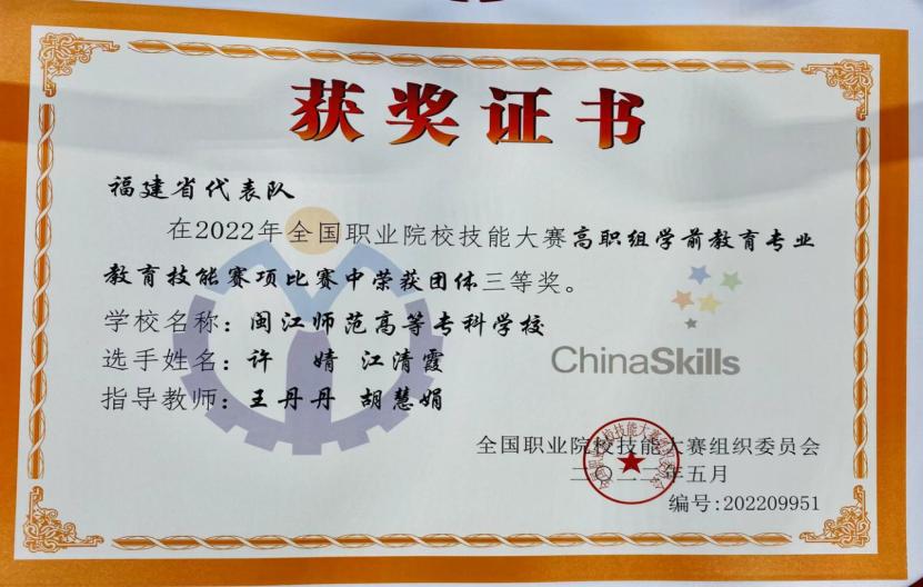 近年来,我校学前教育学院学生曾经三次登上国赛的领奖台,荣获国赛团体二等奖一次,国赛团体三等奖两次。该赛项优异成绩的取得充分展示了我校积极践行“以赛促学、以赛促教、以赛促建、赛教融合”的人才培养成果,也展示了学前教育学院师生积极向上、奋勇拼搏、团结协作的风采和学前教育专业的教学成果。