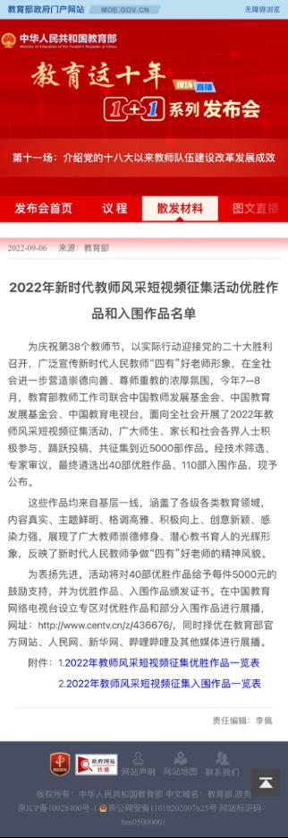 据悉,2022年7月-8月,教育部教师工作司联合中国教师发展基金会、中国教育发展基金会、中国教育电视台,面向全社会开展了2022年教师风采短视频征集活动,收到广大师生、家长和社会各界人士近5000部作品,最终遴选出40部优胜作品、110部入围作品。这些作品均来自基层一线,涵盖了各级各类教育领域,内容真实、主题鲜明、格调高雅、积极向上、创意新颖、感染力强,展现了广大教师崇德修身、潜心教书育人的光辉形象,反映了新时代人民教师争做“四有”好老师的精神风貌。