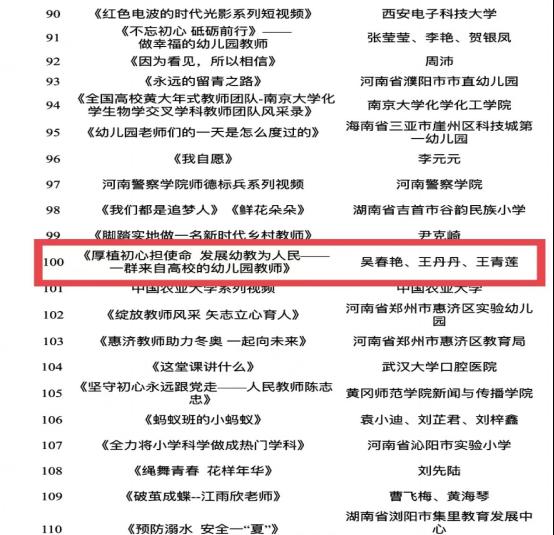 为庆祝第38个教师节,以实际行动迎接党的二十大胜利召开,广泛宣传新时代人民教师“四有”好老师形象,教育部9月6日公布了2022年新时代教师风采短视频征集活动优胜作品和入围作品名单,我校学前教育学院(福州幼教集团)党委报送的《厚植初心担使命,发展幼教为人民——一群来自高校的幼儿园教师》短视频,从全国近5000部作品中脱颖而出,经技术筛选、专家审议,获得入围作品奖。