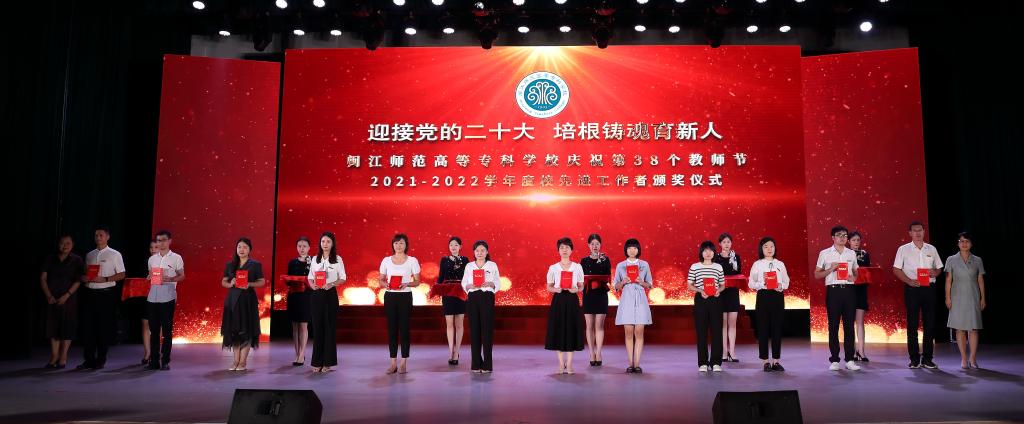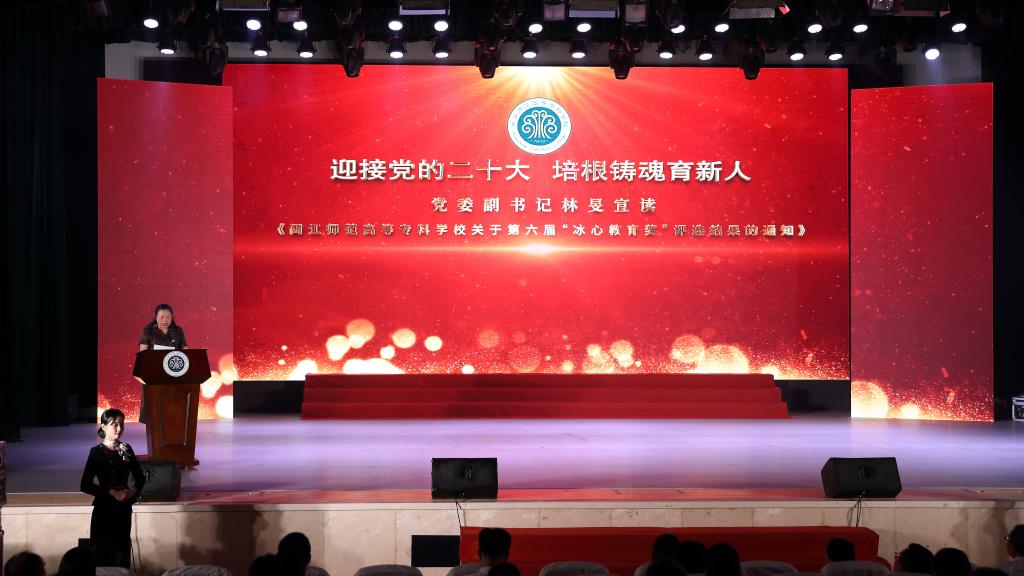 党委副书记林旻宣读《闽江师范高等专科学校关于第六届“冰心教育奖”评选结果的通知》。与会领导给2021-2022学年度校先进工作者、从事教育事业年限男满30周年(女满25周年)的教师、第六届“冰心教育奖”获得者颁发证书。