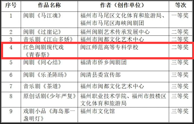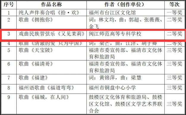 近日,福州市第五届茉莉花文艺奖评审工作结束,经各艺术门类专家进行认真严肃、集中规范、公平公正的评审,共评出拟获奖作品90件。其中,我校戏曲民族管弦乐《又见茉莉》荣获音乐二等奖,红色闽剧现代戏《青春祭》荣获戏剧二等奖。