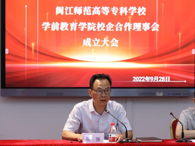 会议开始,陈强宣读《闽江师范高等专科学校关于同意成立学前教育学院校企联合理事会的批复》。