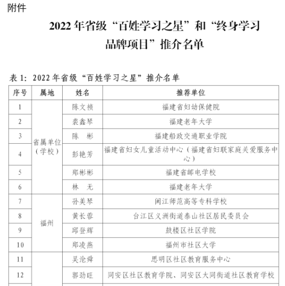 日前,福建省终身教育促进委员会印发《关于公布2022年省级“百姓学习之星”和“终身学习品牌项目”推介名单的通知》,我校继续教育学院孙美琴老师被认定为2022年省级“百姓学习之星”;项目“福州长护险的护理服务人员培训”被认定为2022年省级“终身学习品牌项目”。