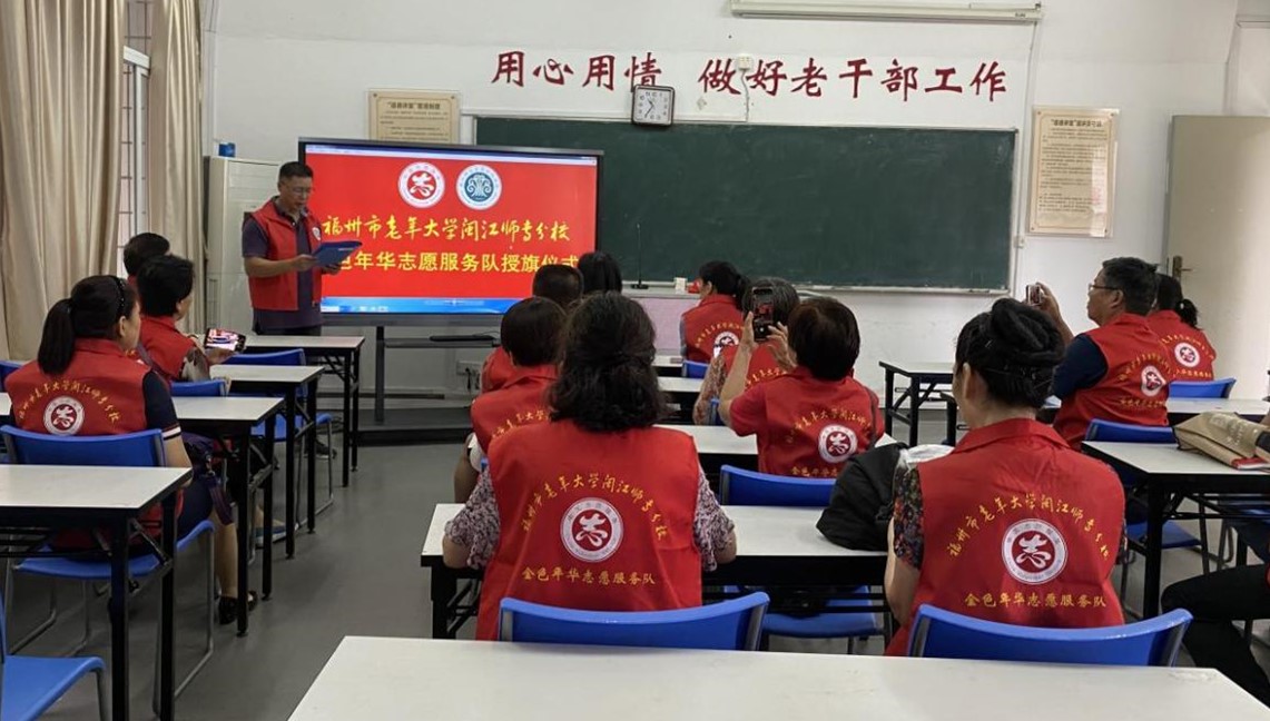 黄耀荣宣读成立福州市老年大学闽江师专分校金色年华志愿服务队的决定,并为志愿服务队授予“福州市老年大学闽江师专分校金色年华志愿服务队”旗帜,队长、副队长上台接受队旗。