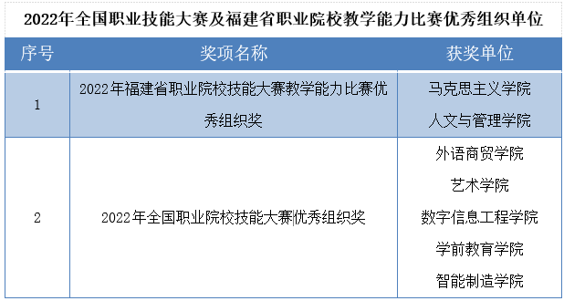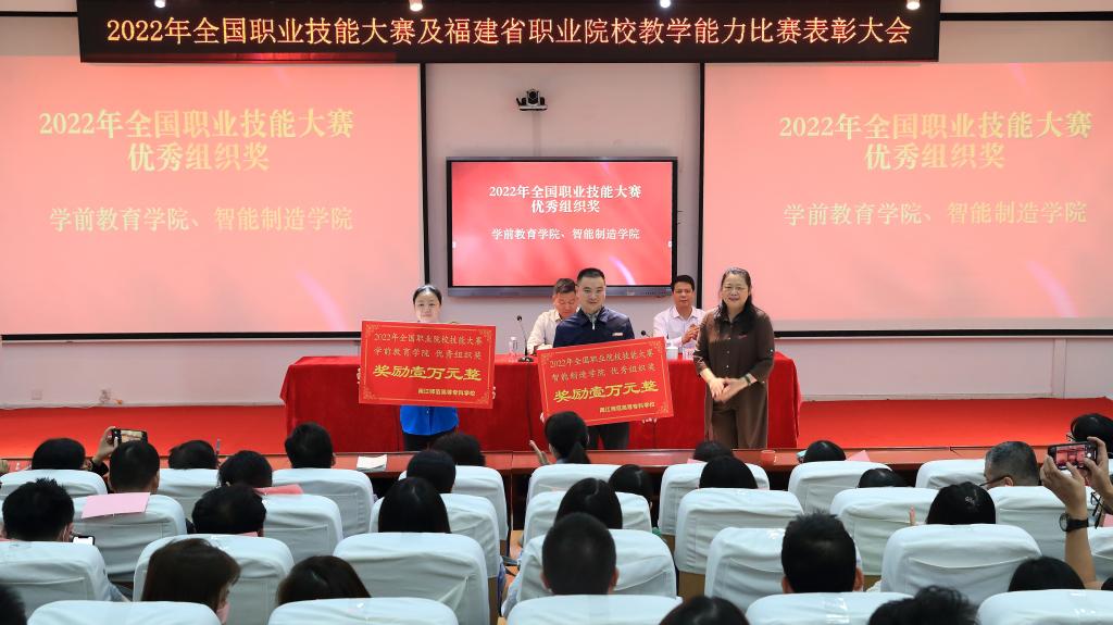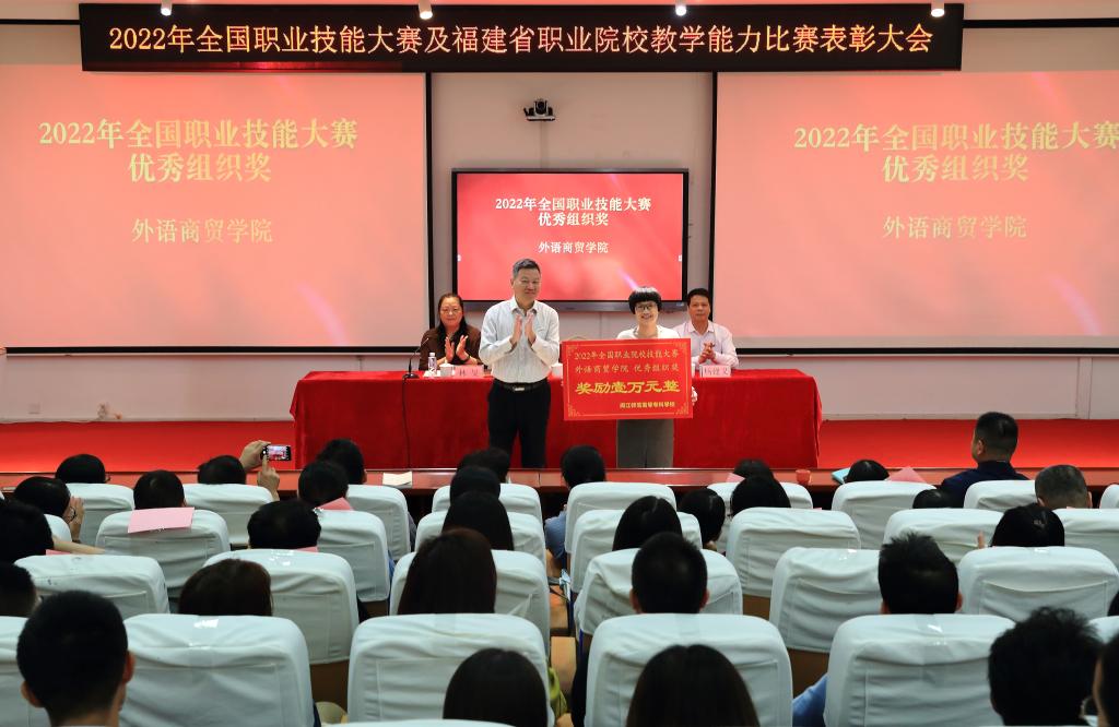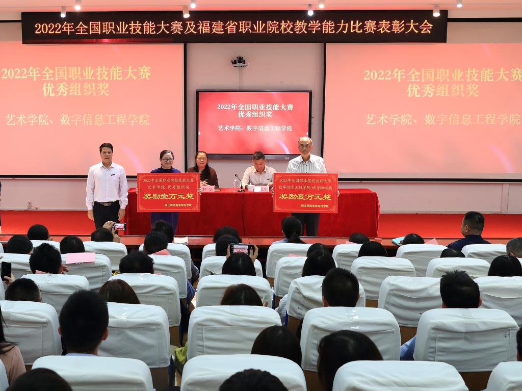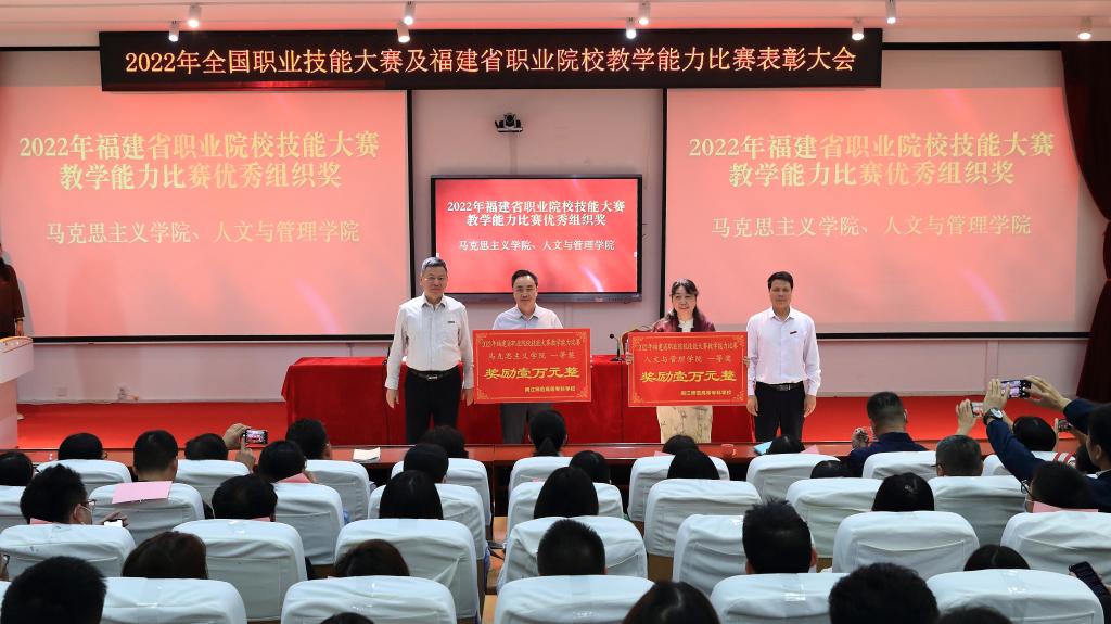 校领导分别为获得2022年全国职业技能大赛及福建省职业院校教学能力比赛优秀组织单位颁奖。