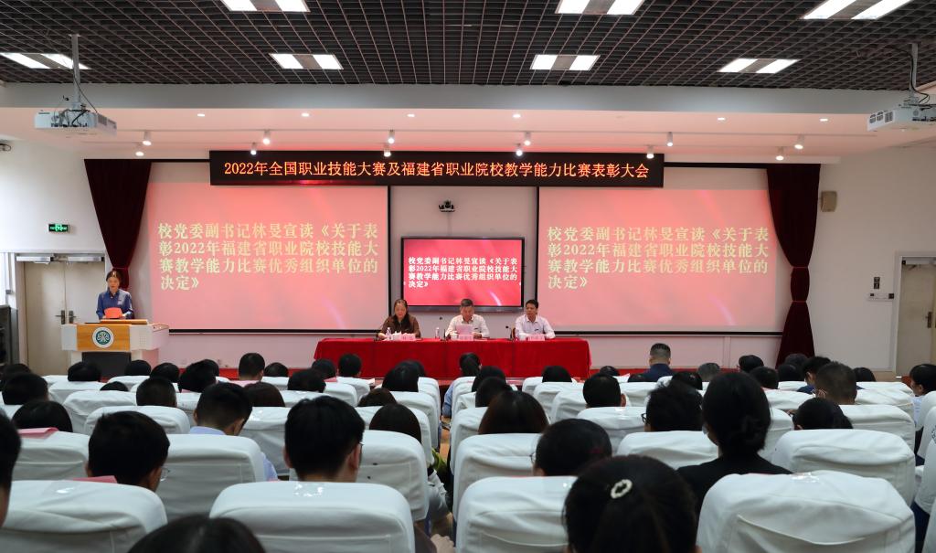 林旻宣读了《关于表彰2022年福建省职业院校技能大赛教学能力比赛优秀组织单位的决定》和《关于表彰2022年全国职业院校技能大赛优秀组织单位的决定》。她指出,参赛师生表现出精湛的职业技能和良好的精神风貌,充分展示了闽江师专学子不畏困难、勇攀高峰的时代风采,充分展示了我校职业教育的办学实力,进一步增强了我校的影响力。