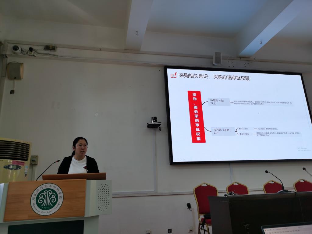 培训内容包括四个模块:采购业务讲解、报账业务讲解、科研经费管理办法解读和固定资产管理答疑。第一模块,由资产处张珊瑚讲解货物及服务采购业务。她详细梳理了各种采购方式操作流程,并通过系统演练展示采购系统操作流程;第二模块,由财务处蔡红讲解财务报账业务。她通过报销实例,为大家讲解了报账系统操作流程及各项目报账材料要求,并对报账过程中的常见问题进行解答;第三模块,科研处林珊湉带领大家解读《科研经费管理办法》,对其中的经费使用要求做了重点讲解;最后一模块,由资产管理处徐叶舟对固定资产管理过程中的常见问题作了梳理。