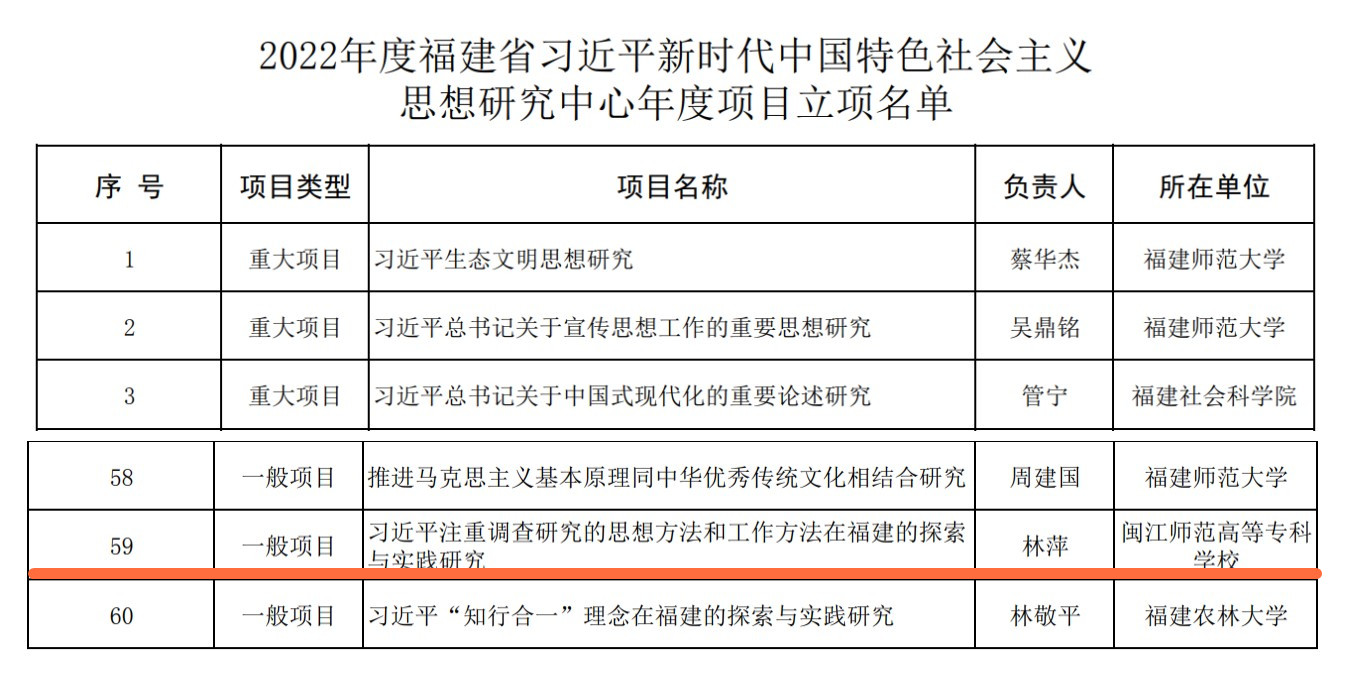 11月8日,福建省社会科学院公布2022年度福建省习近平新时代中国特色社会主义思想研究中心年度项目立项(公示)名单,我校教师林萍主持的课题《习近平注重调查研究的思想方法和工作方法在福建的探索与实践研究》喜获立项。本年度福建省习近平中国特色社会主义思想研究中心一共立项83项,高职高专院校仅有2项。