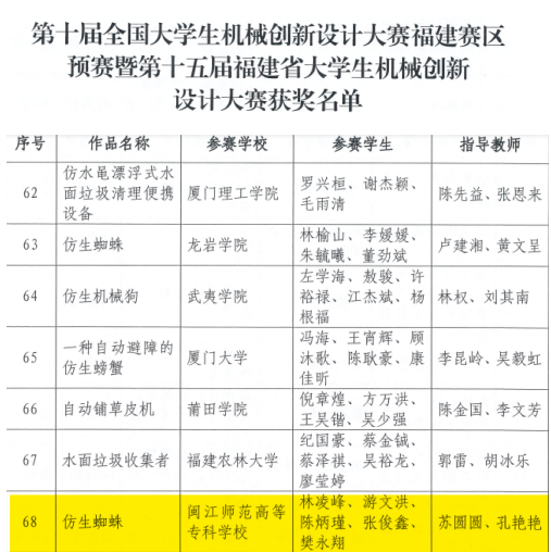 11月7日,第十届全国大学生机械创新设计大赛福建赛区预赛暨第十五届福建省大学生机械创新设计大赛获奖名单公布。由我校智能制造学院苏圆圆、孔艳艳两位老师指导,林凌峰、游文洪、张俊鑫、樊永翔和陈炳瑾五位同学组成的代表队荣获二等奖。