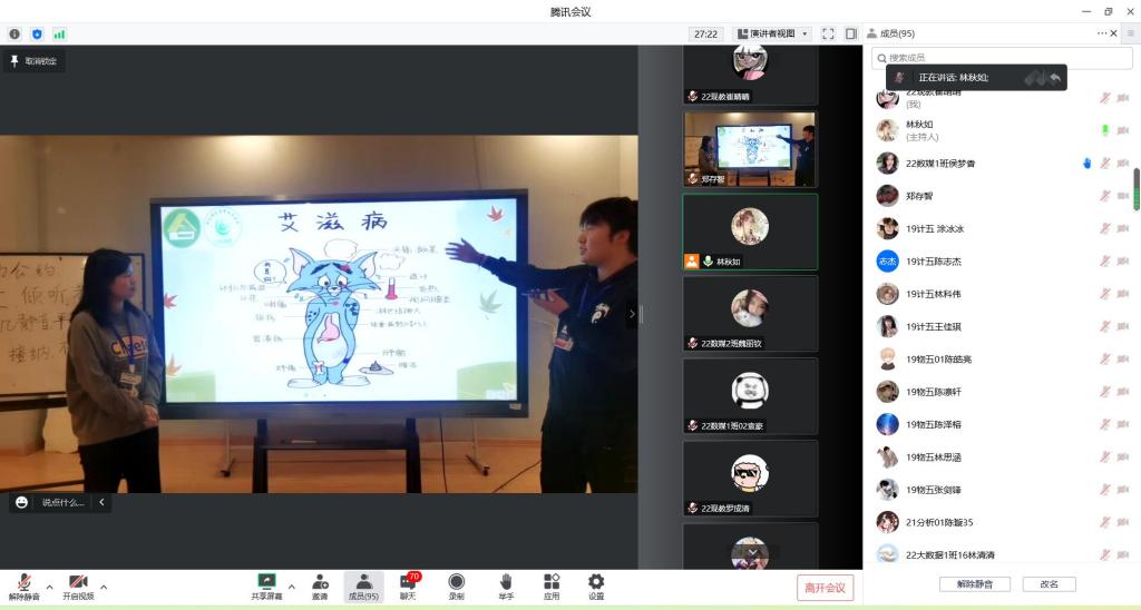 “行动起来,向零艾滋迈进”主题活动中,主持人邀请学员们分享自己对艾滋病的看法,分析了全球艾滋病的流行现状与趋势,增强大家的自我保护意识。在科普环节中,主持人讲解了艾滋病的传播途径、传播条件和红丝带的相关知识,并根据大家的线上留言,强调防艾的知识和危害。