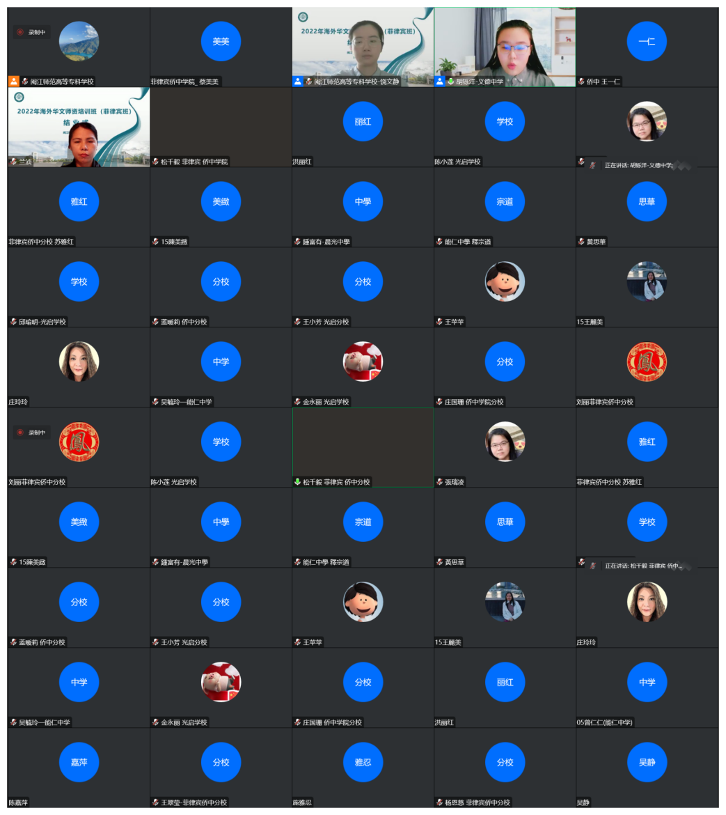 11月20日,2022年海外华文师资研修班(菲律宾班)圆满结束。本次研修班由福建省侨联主办,福州市侨联、闽江师范高等专科学校承办,菲华商联总会和菲律宾华文学校联合会协办。这是我校首次面向菲律宾开展华文师资研修班。来自菲律宾的70名海外华文教师齐聚云端,共同参加了本次为期37天的研修学习。