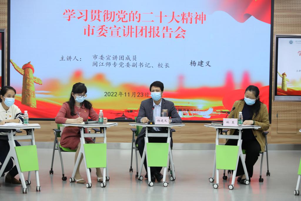 根据市委统一部署,11月23日,学习贯彻党的二十大精神市委宣讲团在我校开展宣讲活动。市委宣讲团成员、我校党委副书记、校长杨建义教授作宣讲报告并召开交流座谈会。校领导、中层干部、校宣讲团成员代表等参加会议,会议由党委副书记林旻主持。