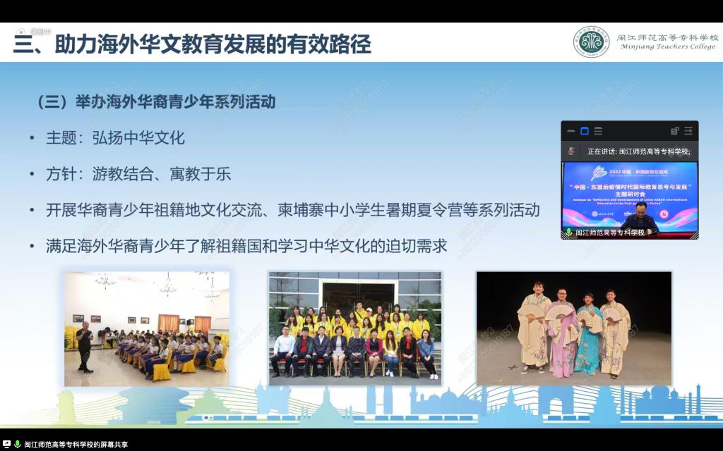 陈强从“中华传统文化与海外华文教育”“海外华文教育发展面临的挑战”“助力海外华文教育发展的有效路径”“对海外华文教育的展望”等四个方面探讨了海外华文教育对传播中华优秀传统文化的重要性,介绍了我校通过打造海内外“政校行企”共同体、服务海外华文教师培训、开展华裔青少年活动等方式传承和弘扬中华优秀文化,为中华传统文化的海外传播搭建桥梁。