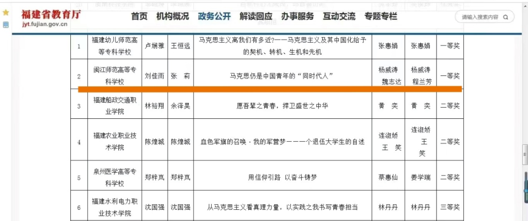 近日,福建省教育厅网站发布《关于第六届“马克思主义能够给予我们什么”福建省高校大学生主题征文和微演讲活动拟获奖名单的公示》,由我校马克思主义学院教师杨威涛、魏志达和程兰芳共同指导,2021级学前教育5班刘佳雨撰写征文、2020级语文教育1班张莉演讲的作品《马克思仍是中国青年的“同时代人”》荣获高职组一等奖。全省高职组仅两个一等奖,这也是我校连续两年荣膺该活动的双一等奖。