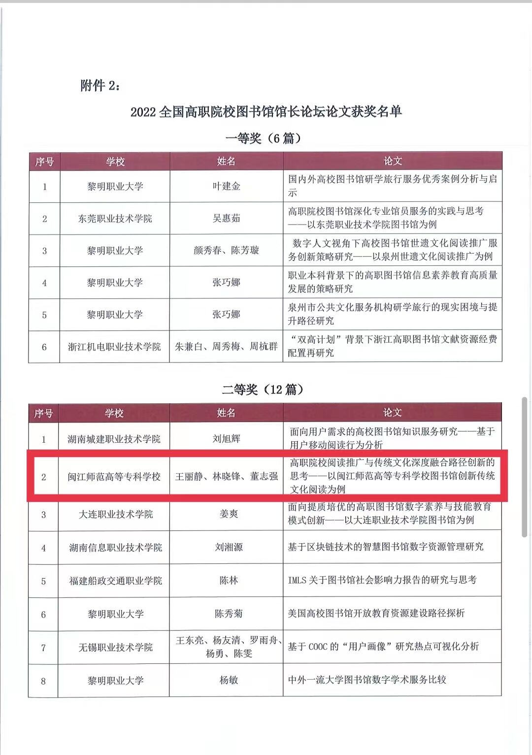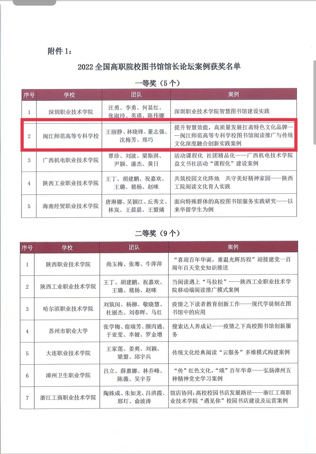 日前,由教育部高等学校图书情报工作指导委员会高职高专院校分委员会、全国高职院校图书馆馆长论坛主办的全国高职高专院校图书馆案例、论文征集评选活动圆满结束。我校图书馆报送的案例《提升智慧效能,高质量发展扛斋特色文化品牌》荣获一等奖;报送的论文《高职院校阅读推广与传统文化深度融合路径创新的思考》荣获二等奖。