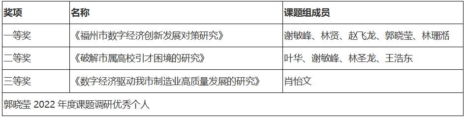 近日,福州市人民政府研究中心组织2022年度市政府系统优秀调研课题评选,我校三项调研成果获得表彰。其中,《福州市数字经济创新发展对策研究》荣获一等奖,《破解市属高校引才困境的研究》荣获二等奖,《数字经济驱动我市制造业高质量发展的研究》荣获三等奖。我校区域经济与教育研究中心郭晓莹获得市政府系统课题调研组织优秀个人。