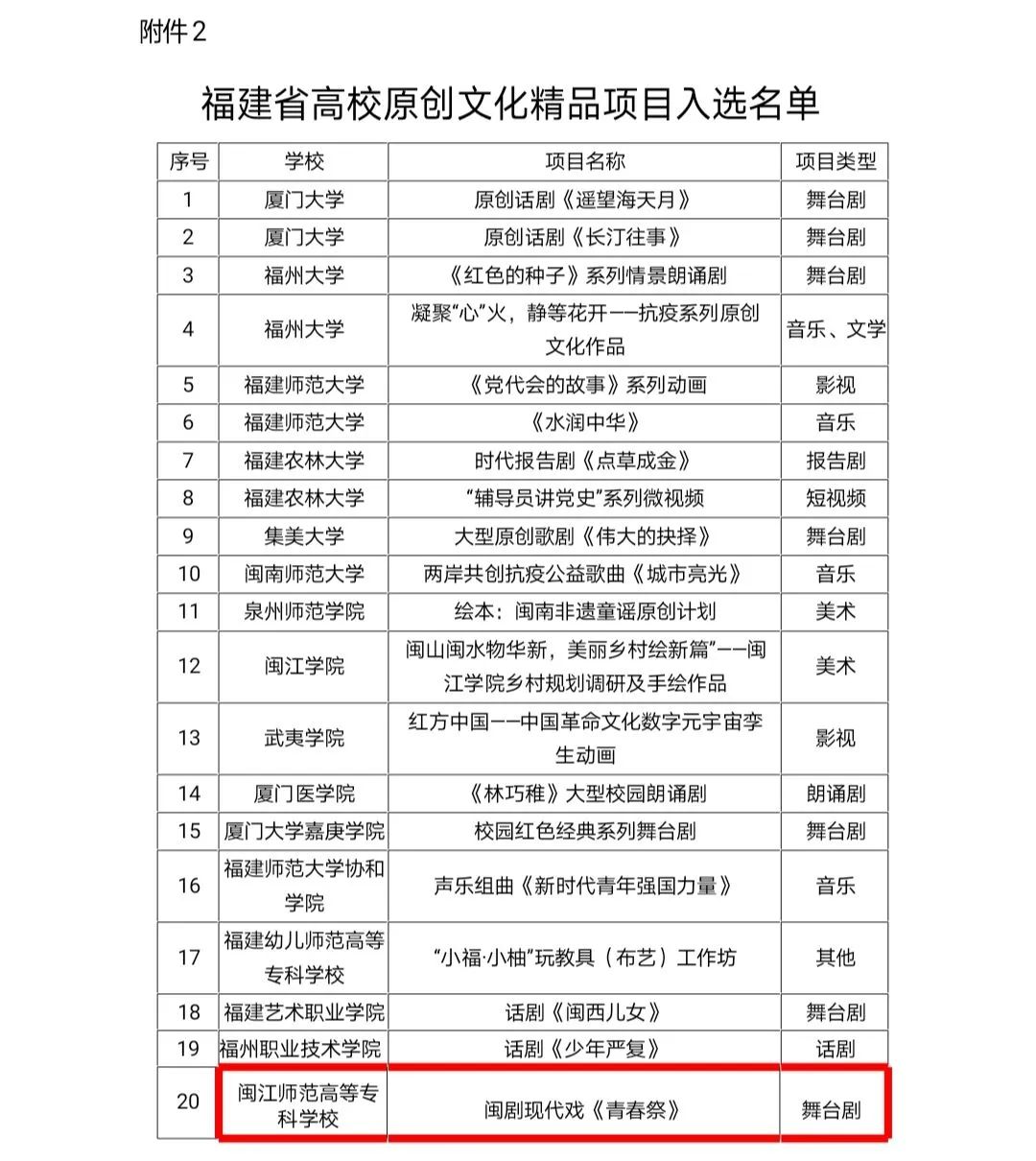 近日,中共福建省委教育工委公布了2022年福建省高校思想政治工作精品项目、高校原创文化精品项目、高校网络教育名师入选名单,我校实践育人项目《搭建“大平台”、建好“大师资”、构建“大课堂”高职美育实践》入选福建省高校思想政治工作精品项目,闽剧现代戏《青春祭》入选福建省高校原创文化精品项目,外语与商贸学院黄凌云入选福建省高校网络教育名师。