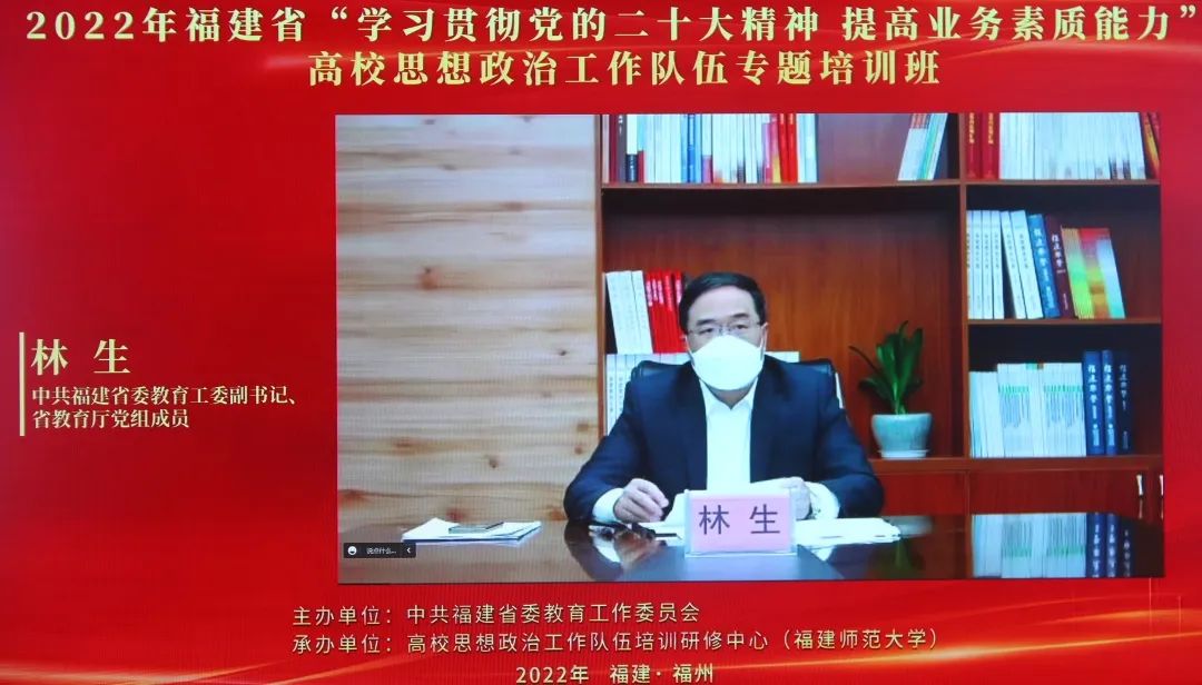 12月28日上午,由中共福建省委教育工委主办、高校思想政治工作队伍培训研修中心(福建师范大学)承办的福建省“学习贯彻党的二十大精神 提高业务素质能力”高校思想政治工作队伍专题培训班开班。省委教育工委副书记、省教育厅党组成员林生出席开班式并作动员讲话。我校副校长谢敏峰、学生处、各二级学院分管学生工作领导、全体辅导员共70余人,以线上和线下相结合方式参加 。