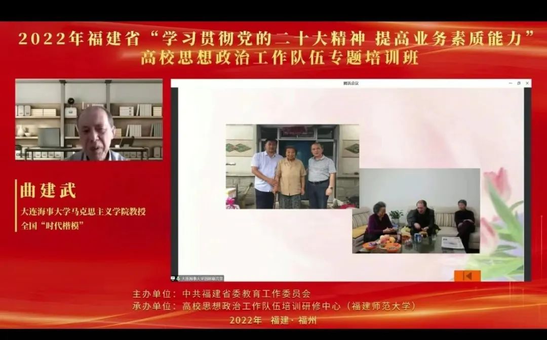 全国“时代楷模”、大连海事大学马克思主义学院曲建武教授为培训班作题为《着力培养担当民族复兴大任的时代新人》的首场专题辅导讲座。讲座中,曲建武教授结合自身丰富的工作经历,从增强使命感和责任感、完成好培养立德树人根本任务等方面,充分运用引导学生成长成才的感人故事,诠释了热爱教育和服务学生的赤诚情怀,彰显了高校思想政治工作队伍的光荣使命与责任担当。