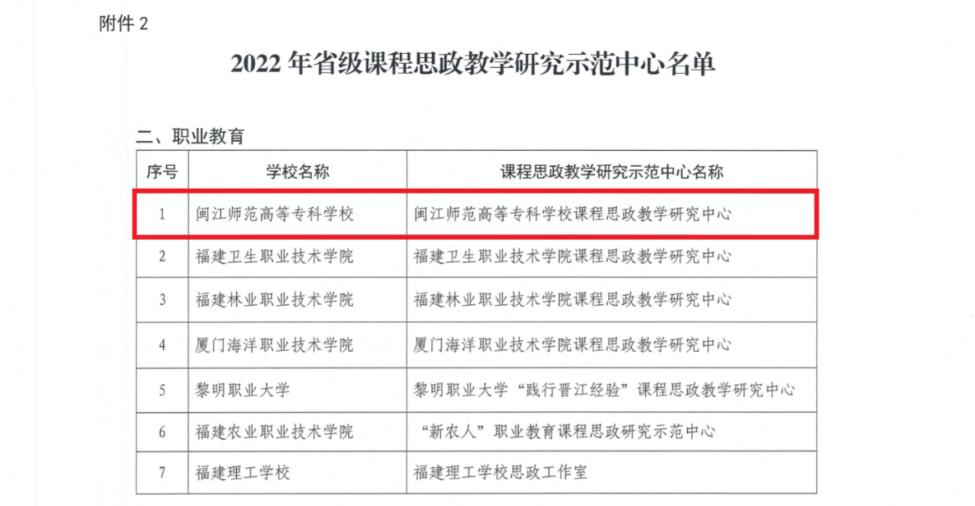 近日,福建省教育厅发布《福建省教育厅关于公布2022年省级课程思政示范项目的通知》(闽教高【2022】37号),我校获批2项省级课程思政示范项目。其中,闽江师范高等专科学校课程思政教学研究中心获批为省级课程思政教学研究示范中心,《英语阅读》课程获批为省级课程思政示范课程,何少娴教授及其带领的教学团队获批省级课程思政教学名师和团队。