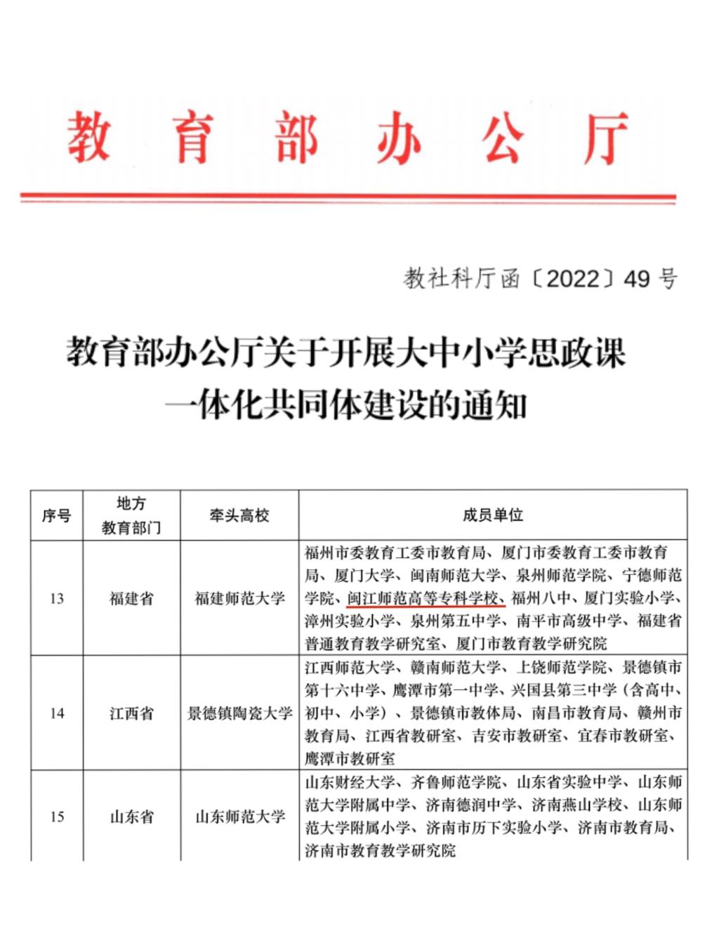为统筹推进大中小学思政课一体化建设,切实发挥思政课立德树人关键课程作用,全面增强思政育人效果,教育部办公厅日前发布《关于开展大中小学思政课一体化共同体建设的通知》(教社科厅函[2022] 49号),福建省的牵头高校为福建师范大学,成员单位中我校是福建省高职高专院校唯一入选的单位。