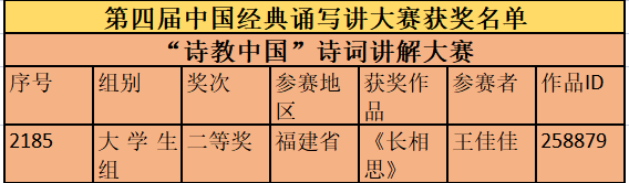 近日,由教育部、国家语委举办的第四届中华经典诵写讲大赛评选结果揭晓,经市级、省级评选,我校小学教育学院陈芳老师指导的2020级语文教育专业王佳佳同学荣获“诗教中国”诗词讲解大赛大学生组全国二等奖,参赛作品《长相思》。