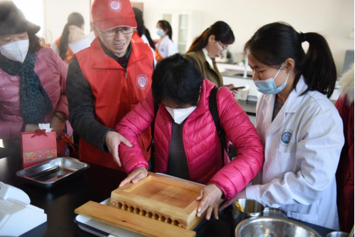 随后,老同志们参观了中医馆,感受中医魅力,李丽华老师为老同志推拿、针灸;王振龙老师在心理团辅室为大家讲解示范心肺复苏;在佘雪花老师和同学们的带领下,老同志们亲手制作中药防疫香囊,体验紫草软膏制作以及观看二冬加味膏制作过程。