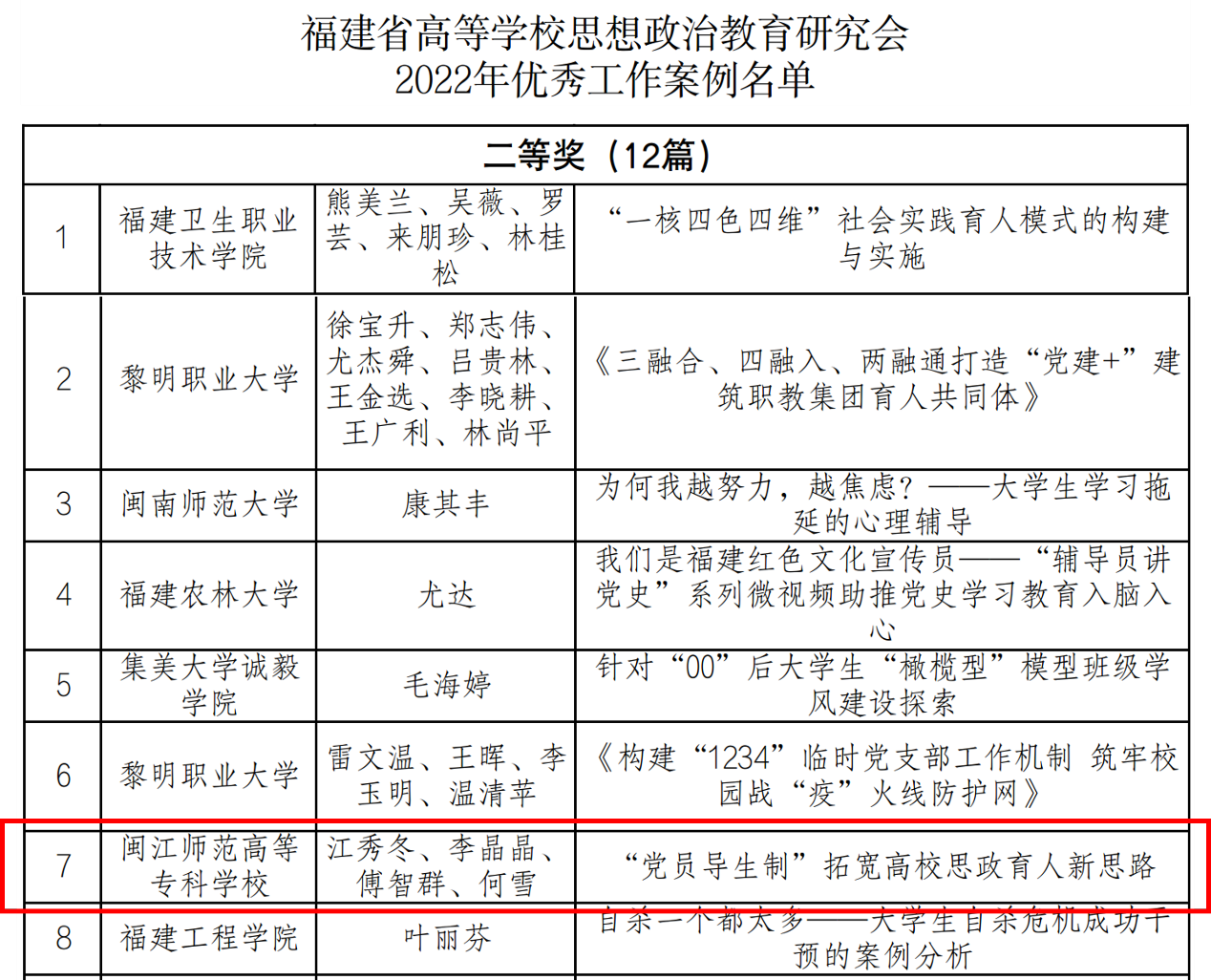2月14日,福建省高等学校思想政治教育研究会公布了“2022年优秀工作案例征集活动”获奖名单,我校数字信息工程学院江秀冬、李晶晶、傅智群、何雪老师的案例《“党员导生制”拓宽高校思政育人新思路》获得二等奖。
