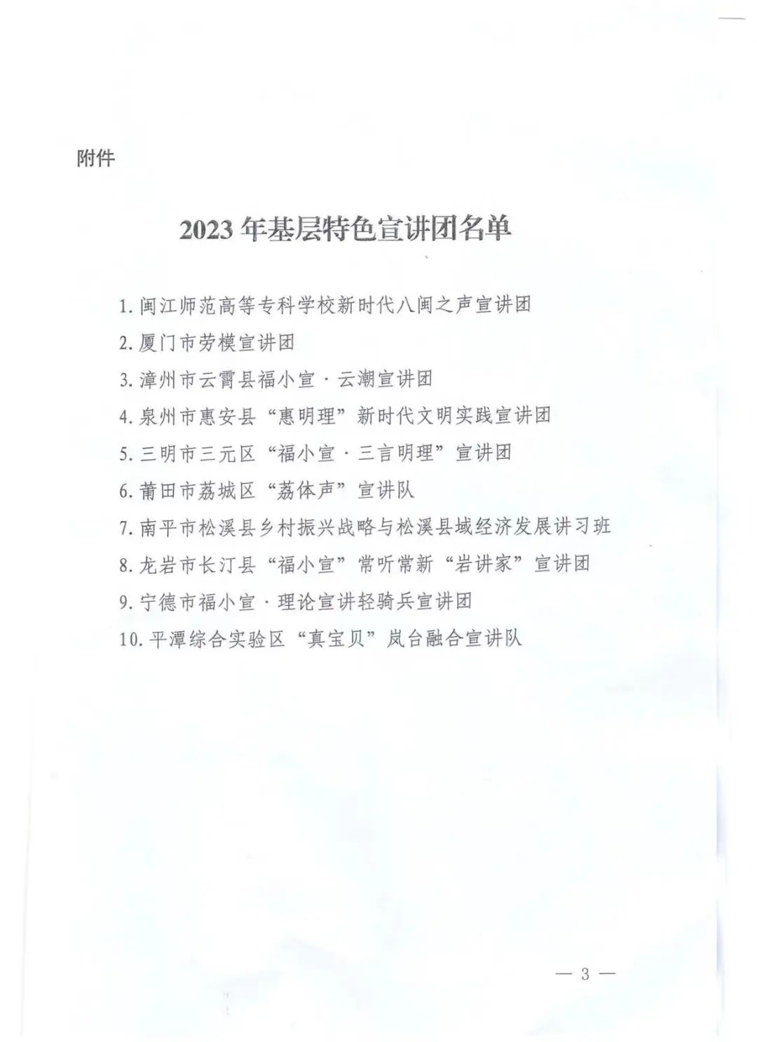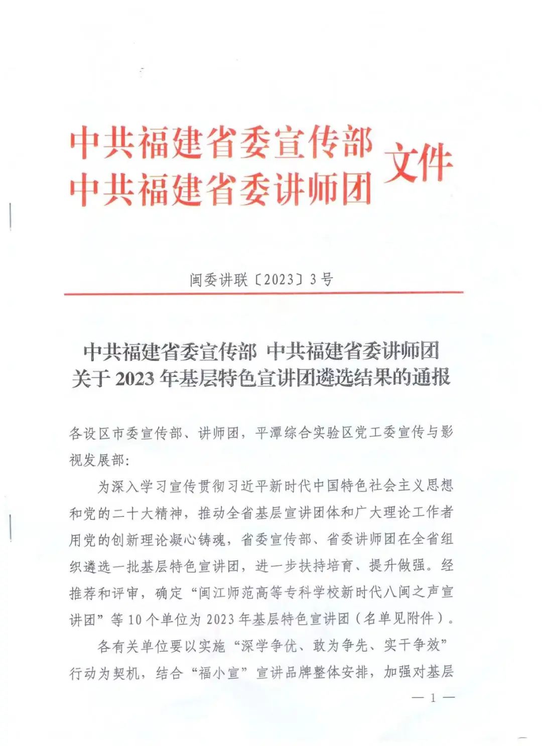 3月6日,我校“新时代八闽之声”宣讲团入选2023年全省十个基层特色宣讲团之一,为福建省唯一一所高校获此殊荣。此次遴选活动由省委宣传部、省委讲师团联合举办,经层层推荐、专家评审,“新时代八闽之声”宣讲团以创新宣讲方式和良好宣讲成效,从全省各类基层宣讲团中脱颖而出。
