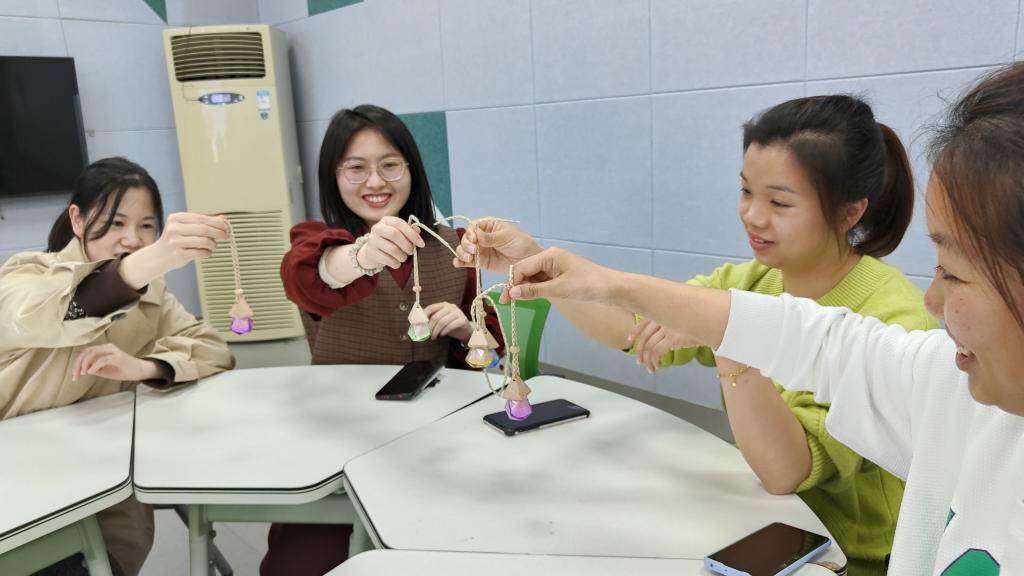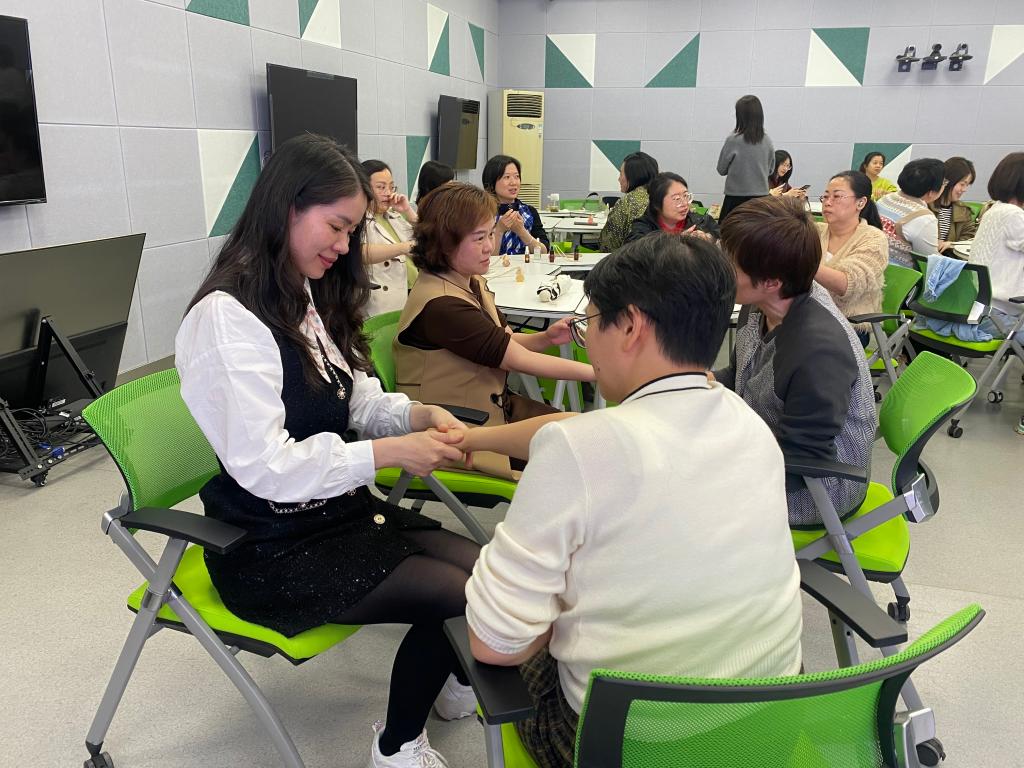课上,每张桌子上都放了不同香味的精油,刘建芳指导大家如何DIY调香。教职工们按照比例调制出属于自己独特芬芳的香水,大家品味芳香,鉴赏美学。