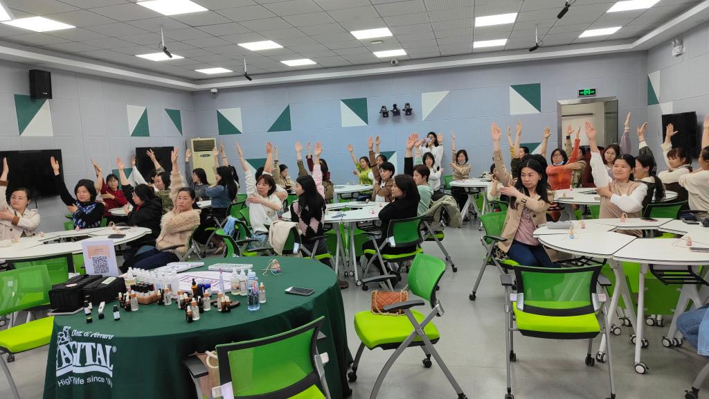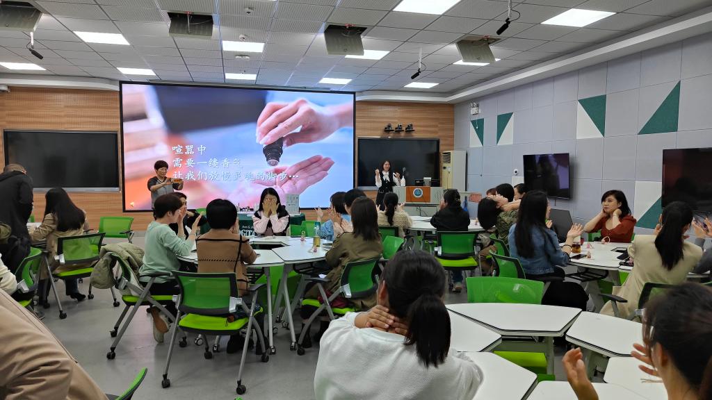 “喧嚣中,需要一缕香气,让我们放慢灵魂的脚步......”4月12日下午,在旗山校区3016教室内,芬芳四溢,沁人心脾,福州市工人文化宫特聘教师刘建芳为学校女教职工带来一堂“芬芳女神”植物精油调香体验课堂,40多名女教职工参与课堂。