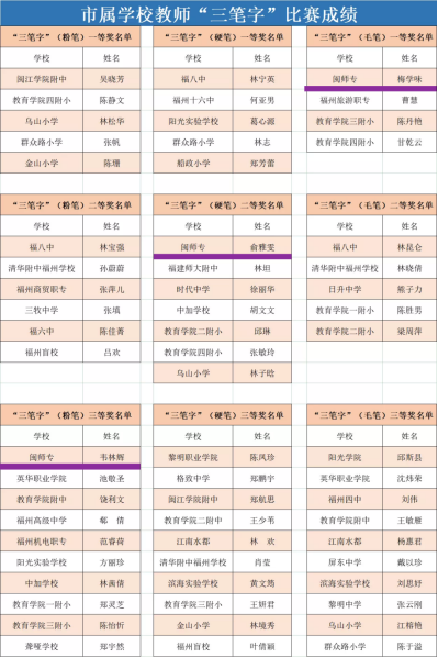 4月15日,由福州市教育工会组织的“建功十四五,奋进新征程”市属学校教师“三笔字”基本功大赛在福州教育学院附属第二小学晋安校区圆满落幕,来自市属学校71所大中小幼儿园近200位教师参加。我校工会选送三位教师参赛,喜获佳绩:小学教育学院工会梅学味获得“毛笔组”一等奖,机关工会第三小组俞雅雯获得“硬笔组”二等奖,附属实验小学工会韦林辉获得“粉笔组”三等奖。