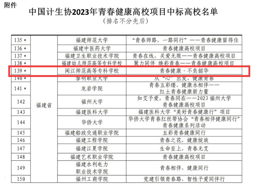 近日,中国计划生育协会发布《关于2023年青春健康高校项目申报结果的通知》(国计生协[2023]25号),我校青春健康基地“青春健康·不负韶华”项目成功荣获A类立项。