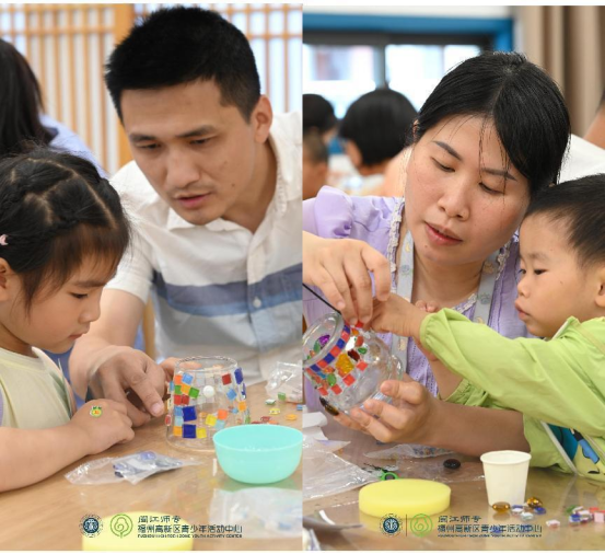 孩子们在老师的指导下和家长一起认真创作马赛克灯