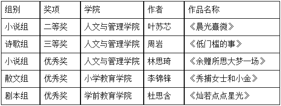 近日,第三届福建省大学生文学创作大赛结果揭晓。我校公共基础部选送的作品荣获二等奖1项、三等奖1项、优秀奖3项,我校荣获优秀组织奖。