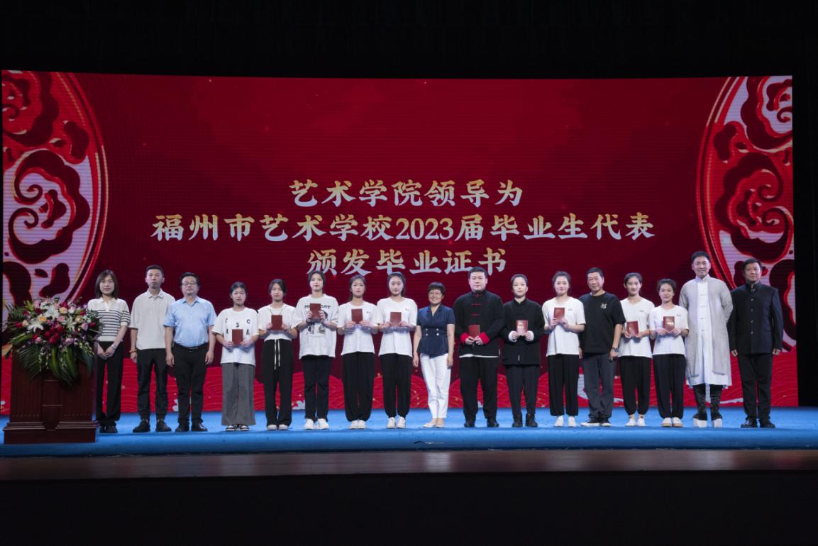 在毕业典礼环节,艺术学院院长徐青《宣读了福州市艺术学校关于准予2023届学生毕业的决定》。校党委书记陈荣生、校长杨建义为表演艺术(二元制)毕业生代表颁发毕业证书。艺术学院领导为福州市艺术学校2023届毕业生代表颁发毕业证书。