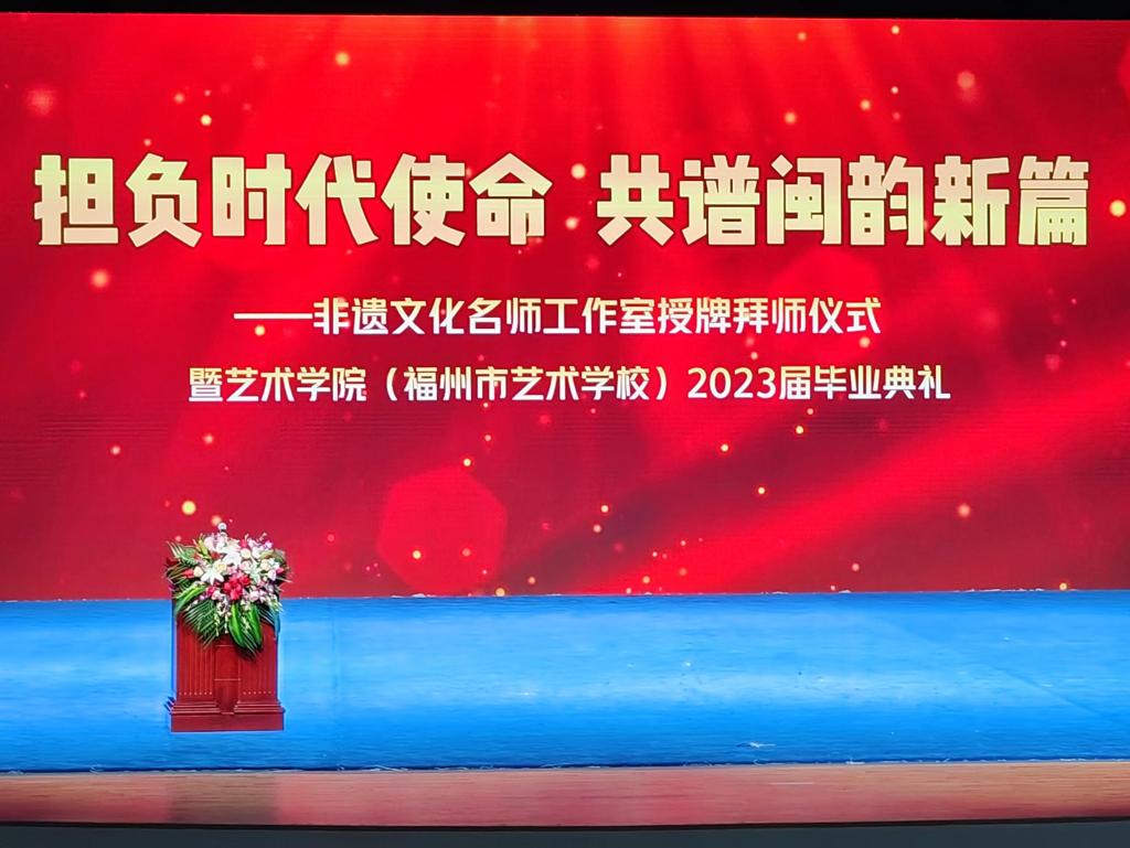 为学习宣传贯彻党的二十大精神和习近平总书记在文化传承发展座谈会上的重要讲话精神,担负非遗传承使命,充分发挥名师示范、引领和辐射作用,全面展示优秀传统文化闽剧艺术传承发展硕果,6月21日,艺术学院(福州市艺术学校)在艺术实训剧场隆重举行非遗文化传承名师工作室授牌拜师仪式暨艺术学院(福州市艺术学校)2023届毕业典礼。校党委书记陈荣生、校长杨建义,表演艺术(二元制)联合办学单位负责人,福建省闽剧艺术发展联盟成员单位负责人,艺术学院党政联席会议班子成员、全体教师、2023届毕业生及家长出席仪式,共同见证这一重要时刻。