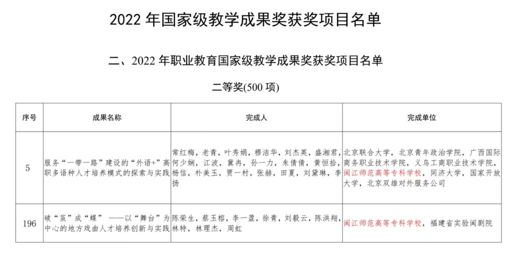 7月21日,《教育部关于批准2022年国家级教学成果奖获奖项目的决定》(教师〔2023〕4号)发布,我校党委书记陈荣生主持的《破“茧”成“蝶”——以“舞台”为中心的地方戏曲人才培养创新与实践》成果荣获职业教育国家级教学成果奖二等奖。我校何少娴教授参与的《服务“一带一路”建设的“外语+”高职多语种人才培养模式的探索与实践》成果获得职业教育国家级教学成果奖二等奖。