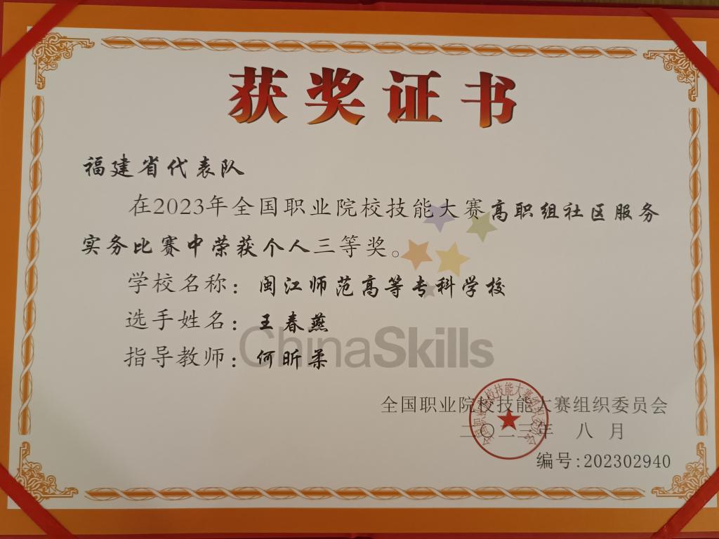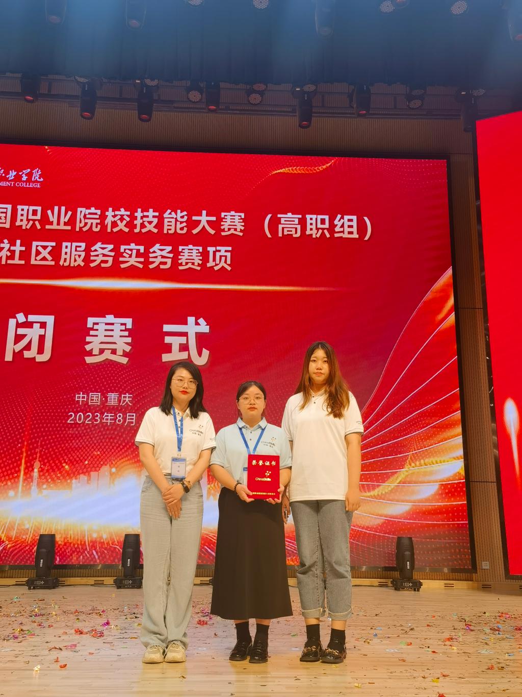 8月28日—29日,2023年全国职业院校技能大赛(高职组)社区服务实务赛项在重庆城市职业管理学院举行。我校人文与管理学院学子王春燕在何昕柔领衔的教师团队指导下,与来自全国52所职业院校的选手同台竞技,发挥社会工作专业勇于拼搏的精神,在比赛中展现了扎实的专业知识和技能,最终荣获三等奖。