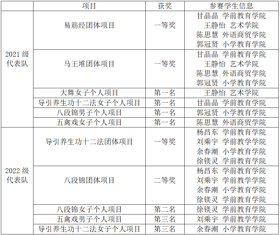 8月26日,由国家体育总局和中国大学生体育协会联合主办的2023年全国高等院校健身气功锦标赛落下帷幕。我校派出领队薛庆云、教练谢群喜以及由陈思慧、王静怡、甘晶晶、郭冠贤、杨昌东、徐镁灵、刘乘宇、余春潮8位学生组成的2021级代表队和2022级代表队两支队伍参加此次比赛。