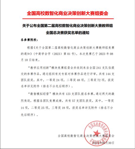 近日,全国第二届高校数智化商业决策创新大赛教师组全国总决赛获奖结果揭晓,我校行政管理专业教师袁曦、陈清芬在本次大赛中荣获二等奖。