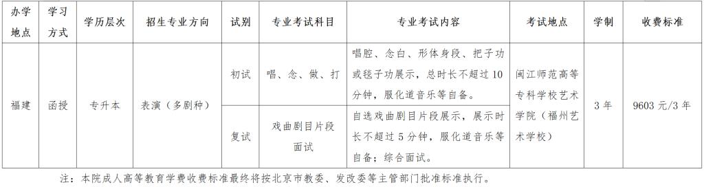 2023年中国戏曲学院计划在福建福州校外教学点招收成人高等教育函授学习方式的学生。考生须参加全国成人高等学校招生统一考试,并在规定时间内在我院福建福州校外教学点进行专业考试报名及考试,未参加专业考试者不予录取。